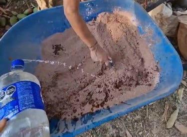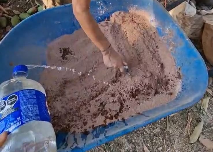 Se prepara una mezcla de tierra, arena y cemento o cal que se humedece levemente revolviendo los materiales.