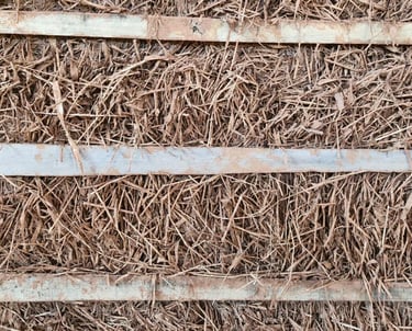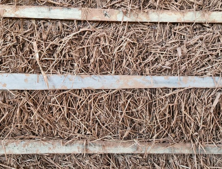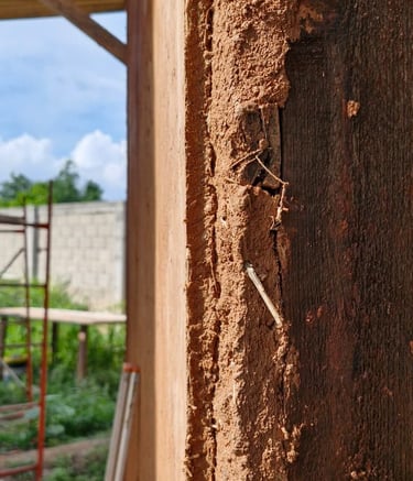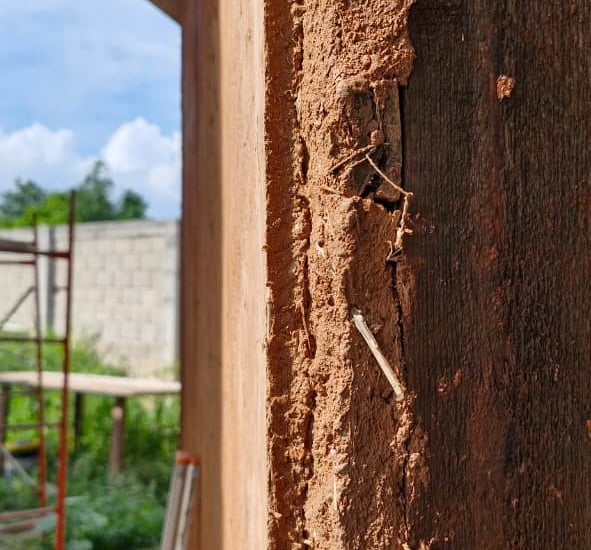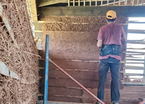 Método constructivo que utiliza varas de Teka para sostener paja que se remoja en barro muy liquido para el relleno de muros.