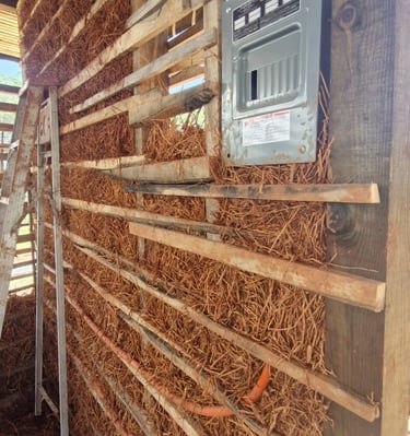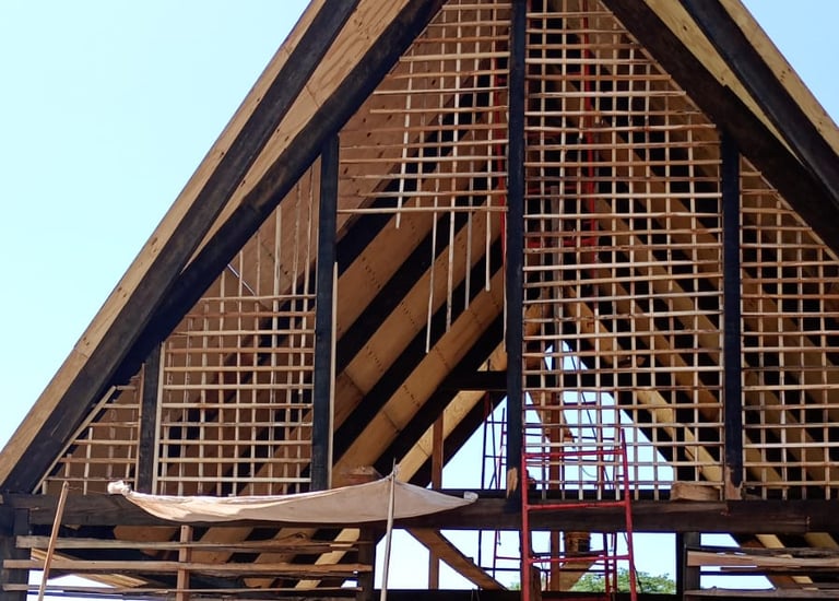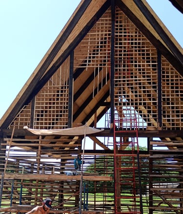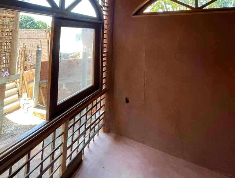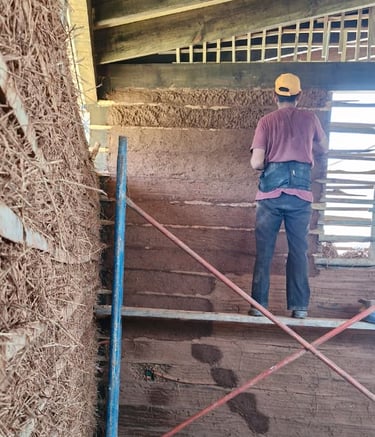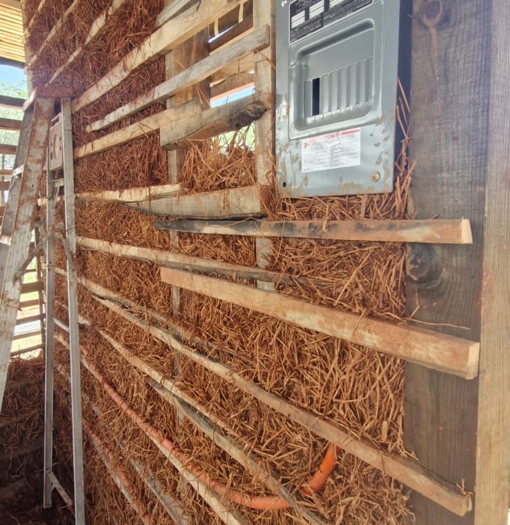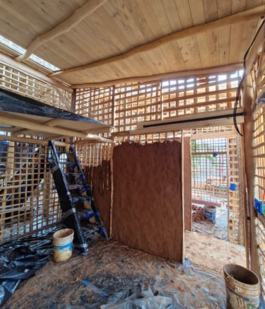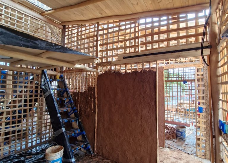 La quincha liviana es una técnica constructiva que utiliza materiales ligeros y sostenibles para crear estructuras eficientes. Nosotros normalmente utilizamos varas de madera de Teka para sostener un relleno de paja con barro muy liquido y de esta manera obtener muros ligeros y gruesos. Posteriormente se les dan enjarres y terminaciones con mezclas de barro, arena y paja para tener acabados planos y duraderos.