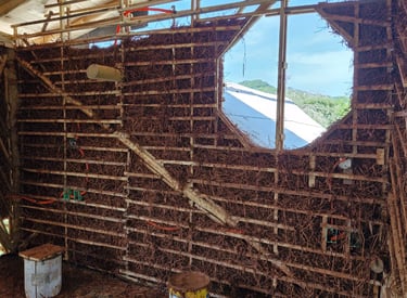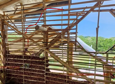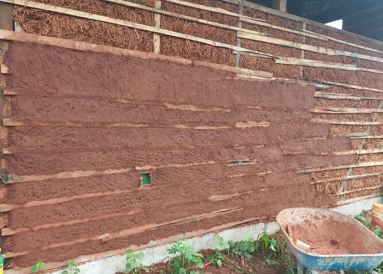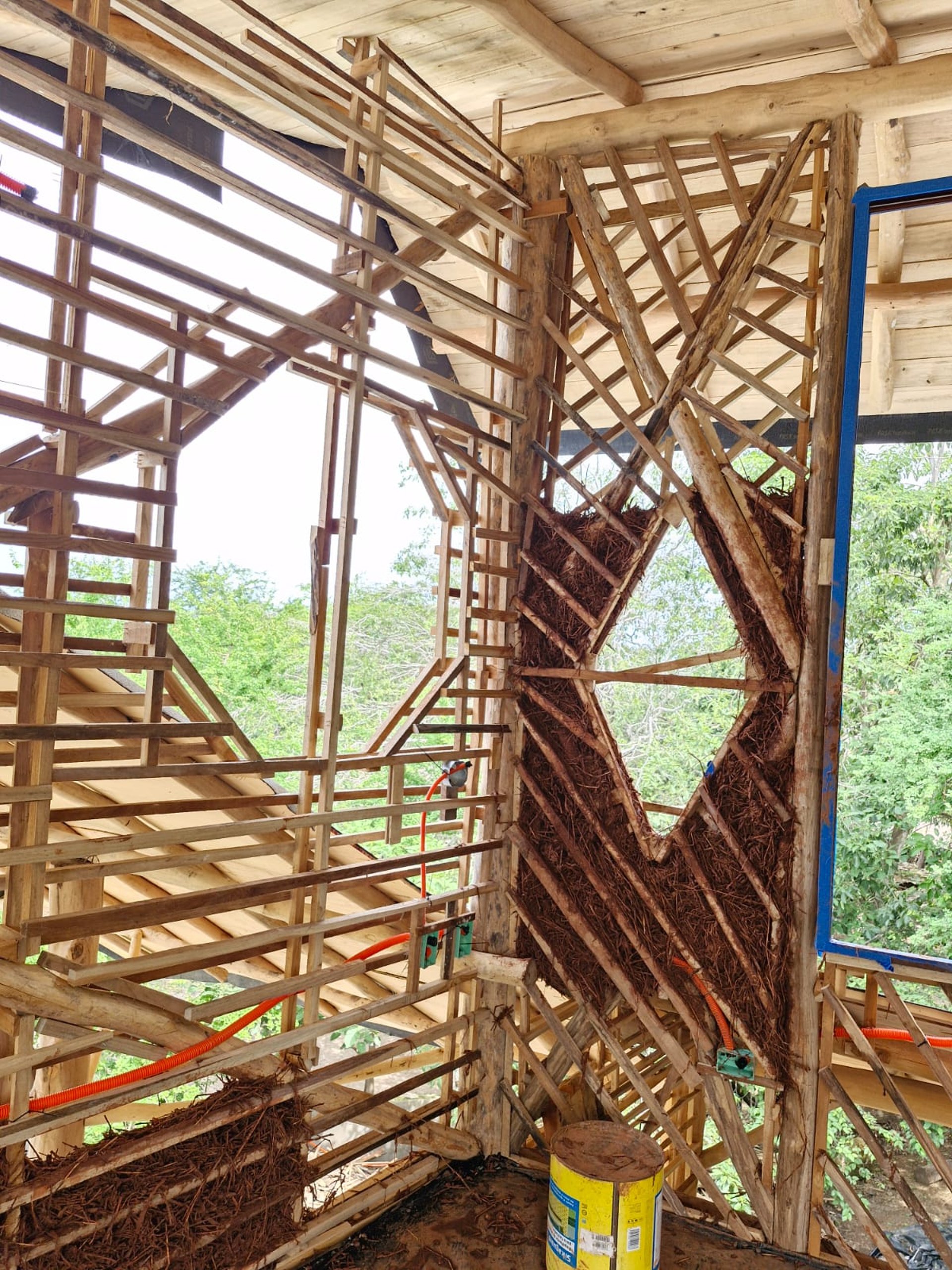 Después del relleno de paja y barro liquido se le aplica una mezcla hecha de barro más solido, arena y paja fina para rellenar el espacio que tenemos entre vara y vara de nuestra estructura de madera.