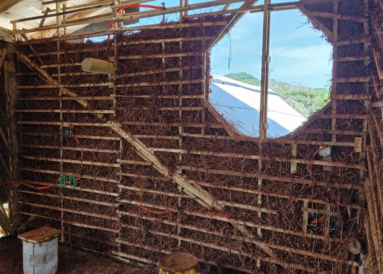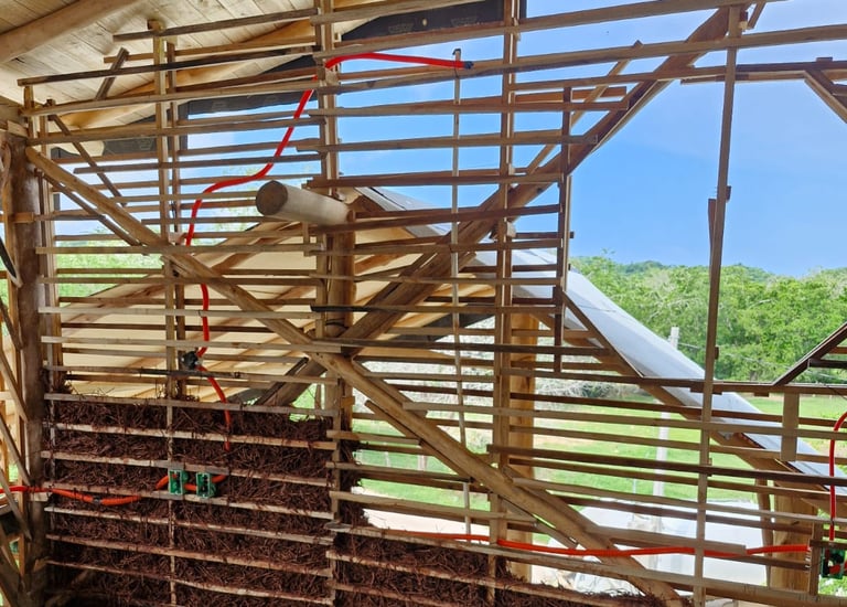 Se construye mediante una estructura horizontal de varas de teka que sostienen el relleno de paja con barro liquido y de esta manera formar un relleno ligero y con aire que permite el efecto termoacústico.