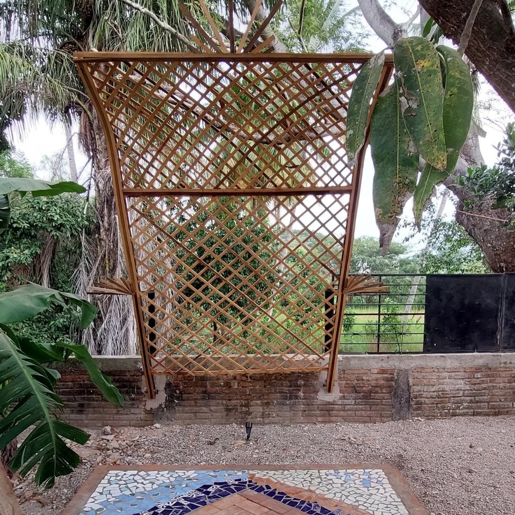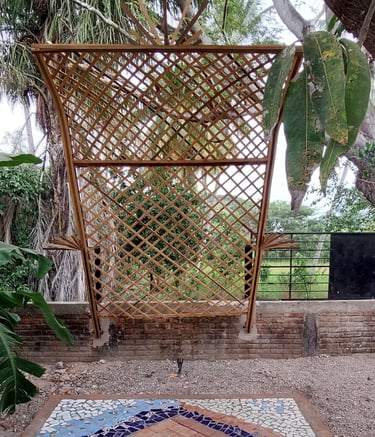 En el escenario se realizo un diseño que da la sensación de estar abrazando el espacio y de esta manera generar una pequeña concha acústica visual. Se utilizaron varas de Parota y Pino generando una cuadricula que transmite un efecto visual armónico para el espacio.