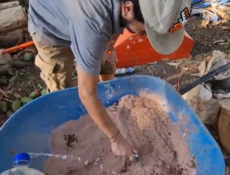 Se prepara una mezcla de tierra, arena y cemento o cal que se humedece levemente revolviendo los materiales.
