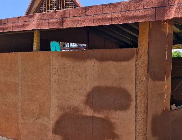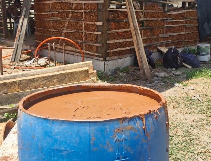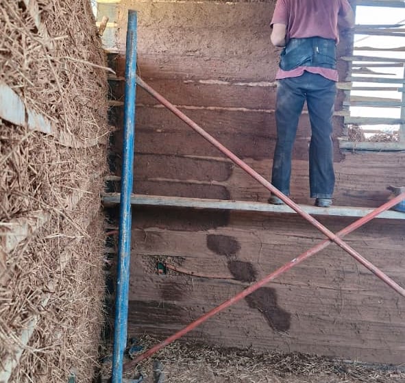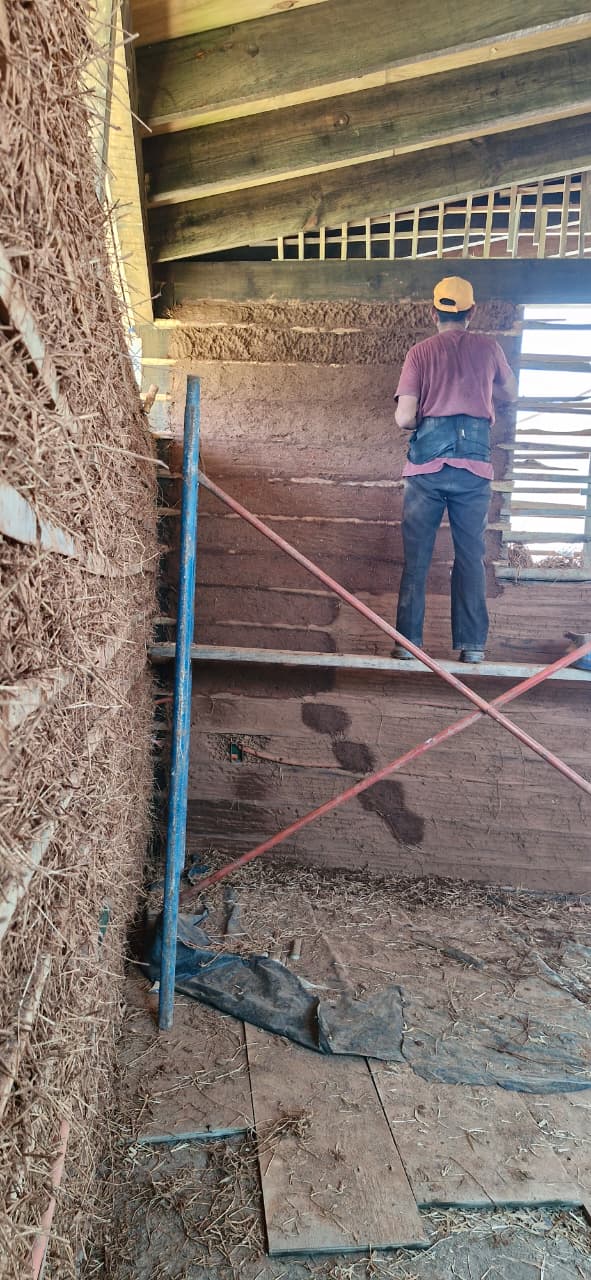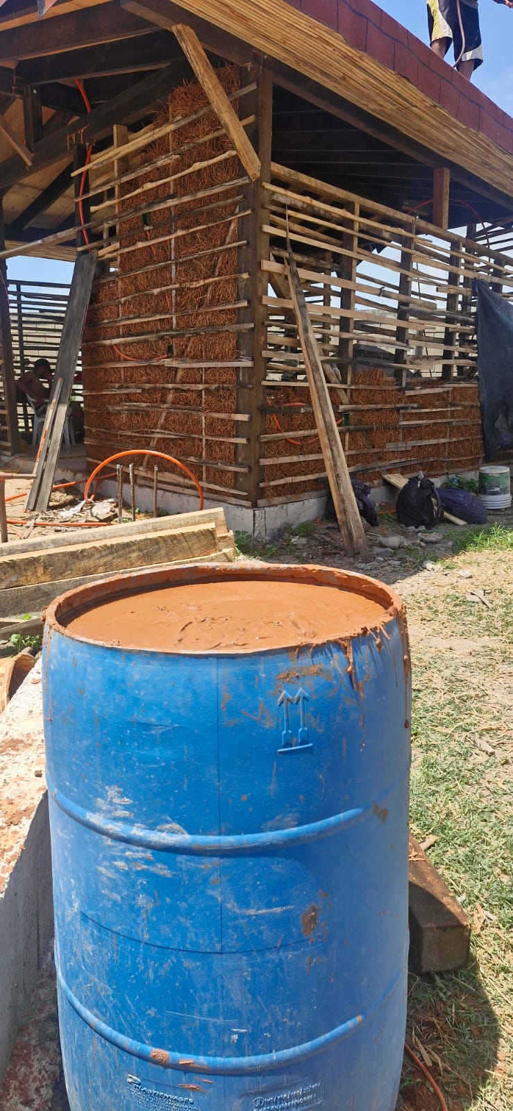 Relleno interno de muros con paja mezclada con barbotina (barro liquido).